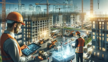DALL·E 2024-06-19 14.47.26 - A detailed image showing construction workers using technology for cost estimation on a small project site. The scene includes a tablet with cost esti